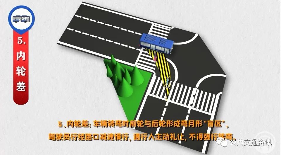 5、內(nèi)輪差:車輛轉(zhuǎn)彎時前輪與后輪形成彎月形“盲區(qū)”,駕駛員行經(jīng)路口減速慢行,遇行人主動禮讓,不得強(qiáng)行轉(zhuǎn)彎。