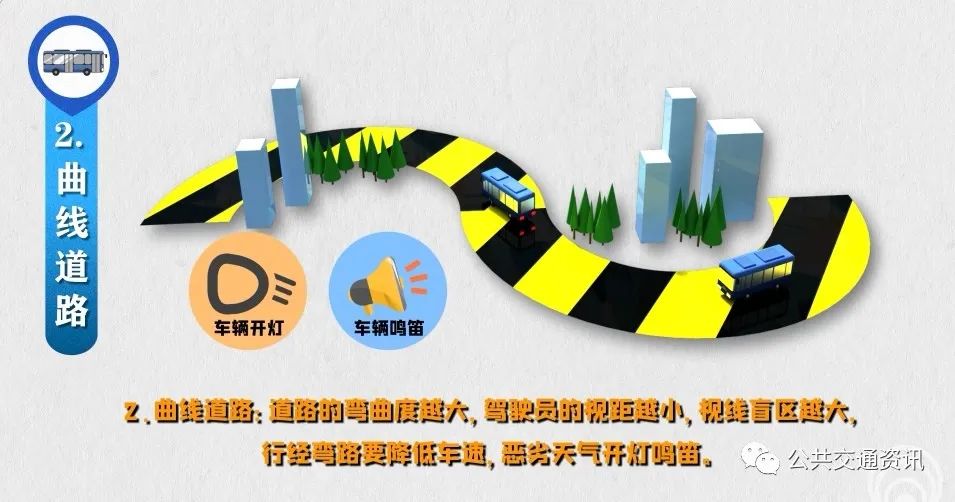 3、路口“盲區(qū)”:行經(jīng)交叉路口容易受樹木、建筑物、施工圍擋等影響,跟車轉(zhuǎn)彎時視線受限,駕駛員要依次轉(zhuǎn)彎,直行車速不超過30公里/時,轉(zhuǎn)彎車速不超過20公里/時。