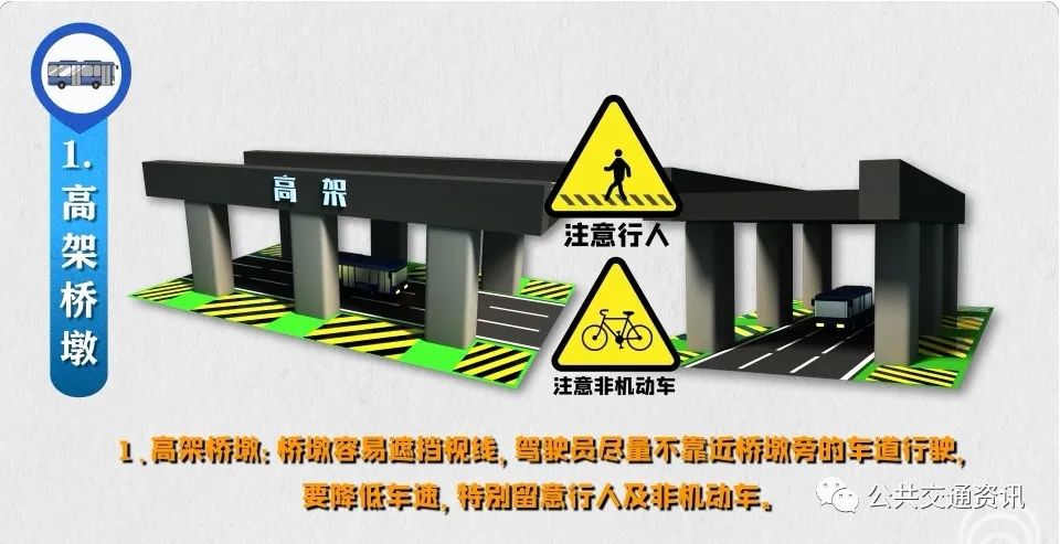 1、高架橋墩:橋墩容易遮擋視線,駕駛員盡量不靠近橋墩旁的車道行駛,要降低車速,特別留意行人及非機(jī)動車。