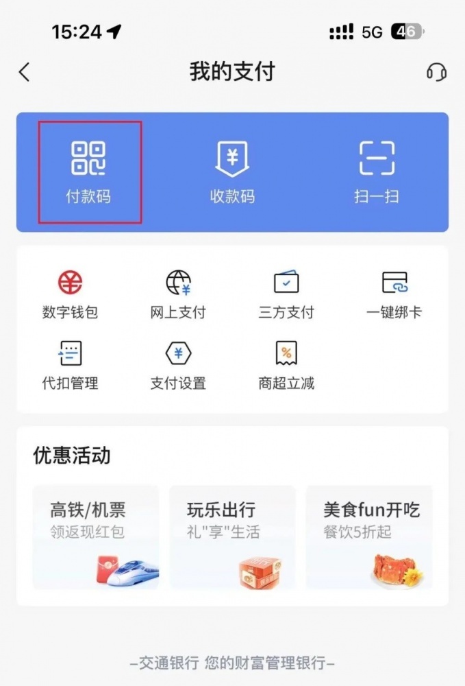 第一步:登錄交通銀行手機(jī)銀行APP-首頁-我的支付-付款碼