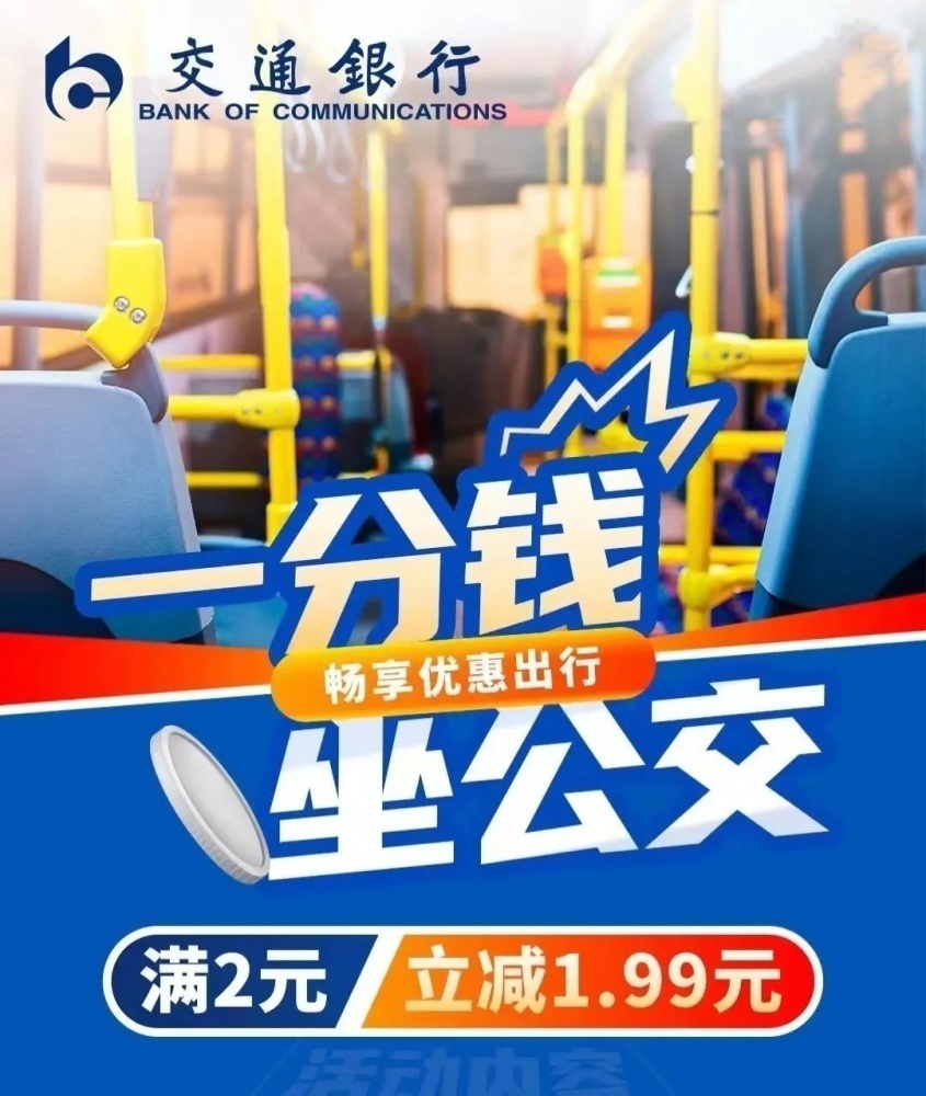 使用交通銀行手機(jī)APP出示付款碼乘車可享滿2元立減1.99元優(yōu)惠?;顒涌偯~10000個,單用戶每日可享受1次優(yōu)惠,每月可享受10次優(yōu)惠,名額有限,先到先得。