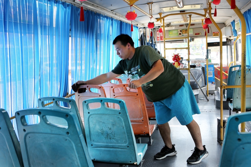 2020#車是揚(yáng)子江早年出廠的一輛“老爺車”,今年即將達(dá)到報(bào)廢年限,但走進(jìn)車廂內(nèi),地板明亮反光,車窗清晰透亮,窗簾座椅清爽整潔,更像是一輛嶄新的“空調(diào)車”,問起如何將車輛打掃得如此干凈,張峻峰講出了他的工作心得。