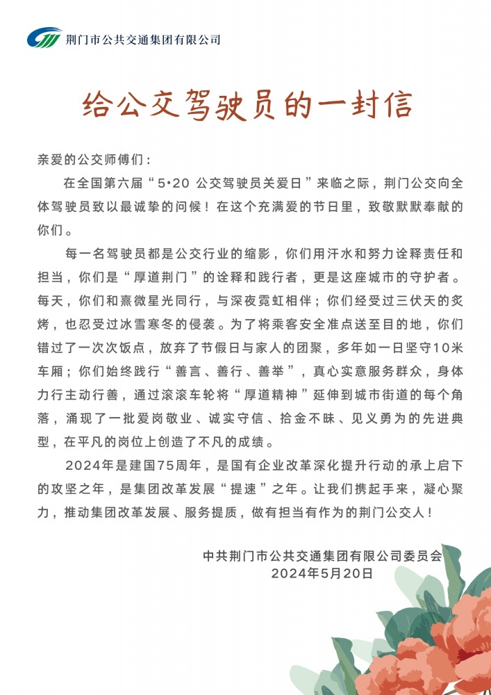 為倡導社會關(guān)愛公交駕駛員,營造理解、尊重公交駕駛員的良好氛圍,5月20日,市公交集團以“全國公交駕駛員關(guān)愛日”為契機,通過一系列關(guān)愛駕駛員的活動,為公交駕駛員們送上節(jié)日祝福和關(guān)愛。