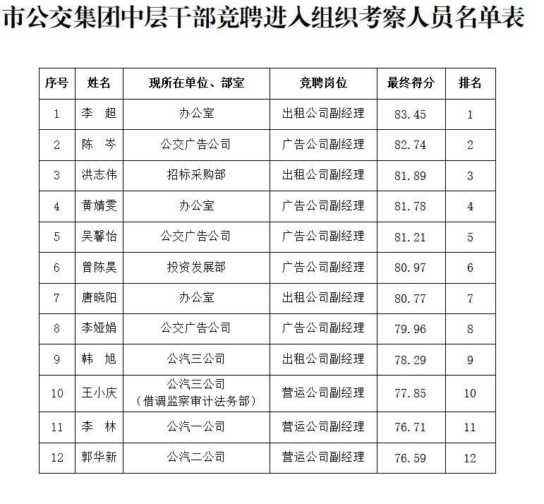 根據(jù)市公交集團中層干部競聘工作要求,共有12名競聘者(最終得分前12名)進入組織考察環(huán)節(jié),現(xiàn)將人員名單公示如下(見附件)。