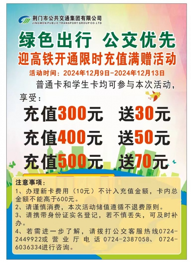 為迎接高鐵開(kāi)通,荊門(mén)公交限時(shí)儲(chǔ)值活動(dòng)開(kāi)啟,具體如下:
