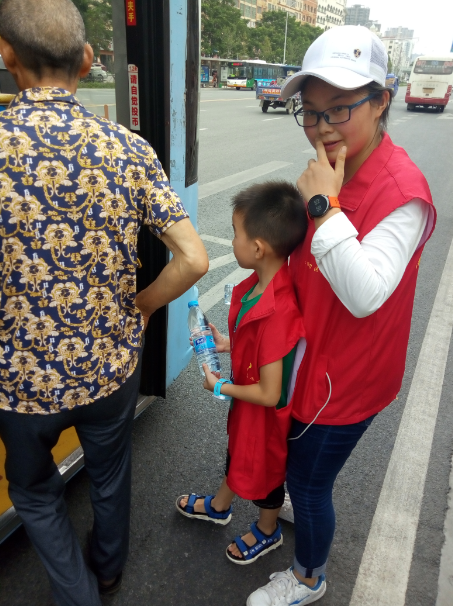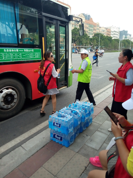 15時(shí)許,志愿者們已經(jīng)布置好了送水點(diǎn),將箱礦泉水?dāng)[在了站臺(tái)旁邊。每有一輛公交車進(jìn)站???,志愿者們都會(huì)給駕駛員們遞上兩瓶礦泉水,還有一些放暑假的小朋友們,也熱情的加入到此次活動(dòng),充當(dāng)著志愿主力軍,用他們的行動(dòng)清涼了公交駕駛員的心,傳播著社會(huì)正能量。