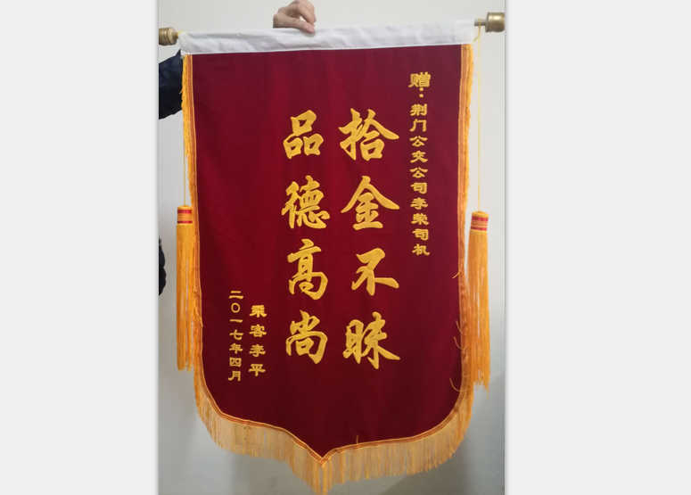 2017年4月4日上午九點左右,一名乘客由于粗心大意,不慎將一個包包遺留在公交車內(nèi),包包內(nèi)裝有蘋果平板電腦一個、手機一部、金銀手飾一包、銀行卡數(shù)張、身份證、現(xiàn)金若干.......二公司三路車159#駕駛員李榮在到達運動公園始發(fā)站打掃衛(wèi)生時發(fā)現(xiàn)了一個紅色包包,該駕駛員立馬與隊長取得聯(lián)系、剛好隊長和站務(wù)在始發(fā)站,駕駛員李榮親自將包交給了隊長,并說明原由,并在眾人下隊長打開了包包,發(fā)現(xiàn)里面的都是貴重物品。不久,失主打包內(nèi)的電話來詢問此事,隊長認真做了回復(fù),告之為保證物品安全,要攜帶證明按程序認領(lǐng)。當(dāng)天下午失主李女土從公司支部書記手中認領(lǐng)失物。昨日送來錦旗一面。
