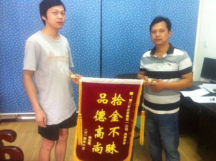 原來(lái),15日下午2時(shí)許,1路公交車司機(jī)吳騰驅(qū)車途經(jīng)城區(qū)長(zhǎng)寧大道長(zhǎng)寧8號(hào)廣場(chǎng)(中百倉(cāng)儲(chǔ))公交站點(diǎn)時(shí),在馬路中央撿到一個(gè)黑色皮包,并及時(shí)上交到公交集團(tuán)公汽一公司。公司負(fù)責(zé)人將皮包內(nèi)身份證信息通過(guò)《荊門(mén)晚報(bào)》及荊門(mén)社區(qū)網(wǎng)絡(luò)媒體發(fā)布尋找失主陳先生信息,陳先生看到招領(lǐng)信息后,很快得知錢(qián)包的下落了,他說(shuō)這(找回錢(qián)包)是他萬(wàn)萬(wàn)沒(méi)想到的。18日上午,陳先生順利地從公汽一公司負(fù)責(zé)人手中認(rèn)領(lǐng)到丟失的錢(qián)包,并特意為吳師傅制作了一面"拾金不昧 品德高尚"錦旗表示謝意。