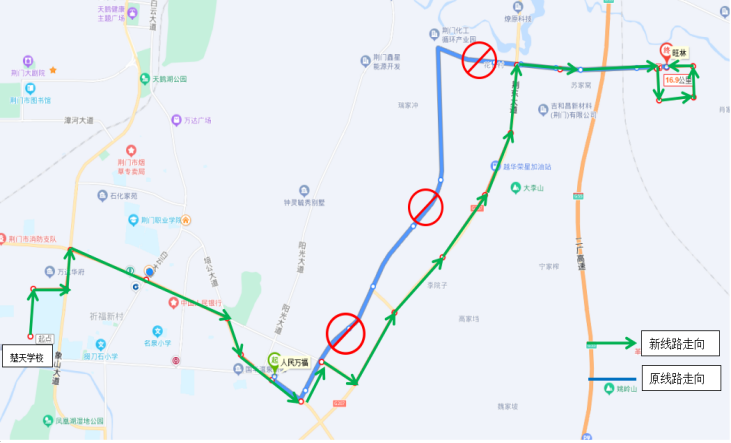 一.優(yōu)化調整33路公交線路走向 ◆首末站:楚天學?!郑ㄐ】的下繁保?/p> ◆首末班時間:6:50—17:45 ◆線路走向:響嶺路—運動公園路—象山大道—深圳大道—培公大道—荊和大道—深圳大道—荊東大道—興化三路—格林北路—興化四路—小康南路 ◆停靠站點:楚天學校、雙喜街辦、運動公園路、萬達廣場、掇刀檢察院、掇刀法院、掇刀公安分局、南城明珠、中國人民銀行、市氣象局、襄荊高速、雙泉社區(qū)、人民萬福商貿城、人民一品花園、虎頭山、殯儀館、馮廟村、固潤科技、東方雨虹、圣通石化、荊東消防、荊東大道興化五路口、潤都制藥、興化三路西、興化三路中、興化三路盈德氣體、紐蘇萊、旺林、興化四路、小康南路北。 ◆取消原33路途經(jīng)荊和大道等路段站點:荊和大道南、陽光五路、陽光四路、陽光三路、化工產業(yè)園行政大樓。 二.優(yōu)化調整69路公交發(fā)班時間 ◆調整前 園博園東門發(fā)班時間:6:40、7:40、15:30、16:30、17:15 玲瓏輪胎發(fā)班時間:7:30、8:30、16:30、17:30、18:00 ◆調整后 園博園東門發(fā)班時間:6:40、7:20、15:30、16:30 玲瓏輪胎發(fā)班時間:7:30、8:20、12:20、16:20、17:30