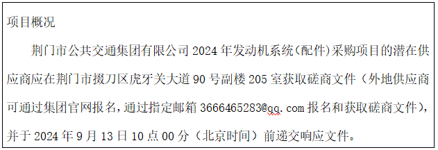 項(xiàng)目名稱(chēng):荊門(mén)市公共交通集團(tuán)有限公司2024年發(fā)動(dòng)機(jī)系統(tǒng)(配件)采購(gòu)項(xiàng)目