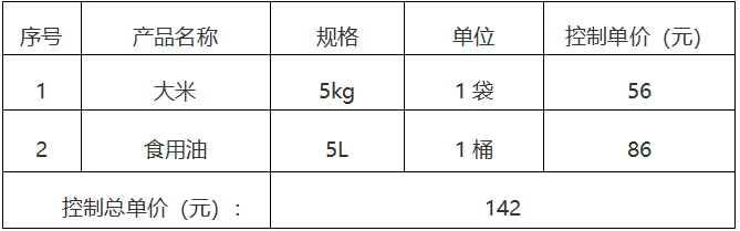 預(yù)算金額:本次詢價(jià)對(duì)大米、食用油的單價(jià)、合計(jì)總單價(jià)進(jìn)行詢價(jià),在各分類報(bào)價(jià)不超過控制單價(jià)(含稅)的前提下,控制總單價(jià)142元,超過此采購預(yù)算的報(bào)價(jià)無效。